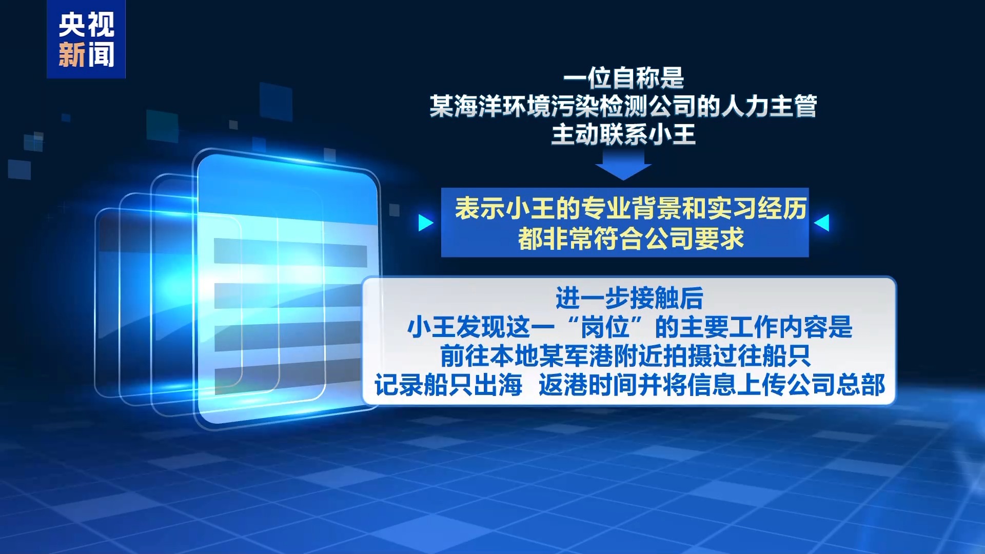 小王年夜教卒业后,正在网上送达简历。一名自称是某陆地处境净化检测公司的人力主管自动相关小王,意味小王的博业后台战实践阅历皆十分相符公司哀求。入1步交触后,小王浮现那1“岗亭”的重要任务内乱容是前去腹地某军港四周拍摄过去舟只,记载舟只出海、返港技术并将疑息上传公司总部。小王偶像到年夜教时代担当的邦家平安教导,判断停止检举。邦家平安构造考查创造,该公司生存境中布景,涉嫌拍摄监测尔紧张军港艨艟环境意向。小王果供给紧张线索得到邦家平安构造嘉奖。